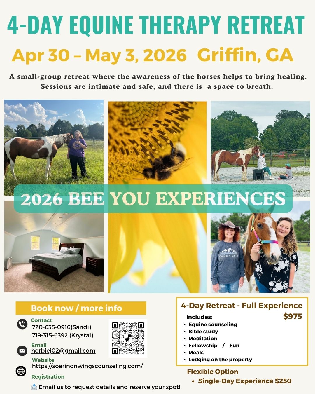 At Bee You Retreats, through equine-assisted counseling, reflection, meditation, Bible study, fellowship, and time set apart, we create space to release old lies and reconnect with the self God intended.